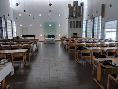 Kirkon ja seurakunnan yhteinen tila on oikea tilaisuus kokoontumiselle ja juhlimiseen. Esteetön kulku ja WC ovat mukavat kÀyttÀjiille. Samassa rakennuksessa toimii kirkkoherran virasto.