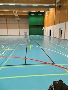 Nykyaikainen liikuntahalli. Hyvä matto salibandyn pelaamiseen. Kenttä vaikutti vähän täysimittaista lyhyemmältä mutta voi olla, että täyttää kriteerit. Ylätasolla ok katsomo missä penkkejä ja näkymä menettelee.